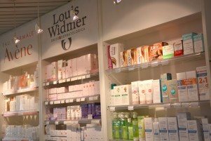 Un espace est réservé aux produits cosmétiques avec une gamme classique (Widmer, Avène, Aderma, La Roche Posay, Mustela) mais aussi une gamme « cosmétique 100 % naturelle » (Weleda, Bee Nature). La pharmacie fait également la part belle aux produits de médecines douces comme l'aromathérapie et la phytothérapie.
